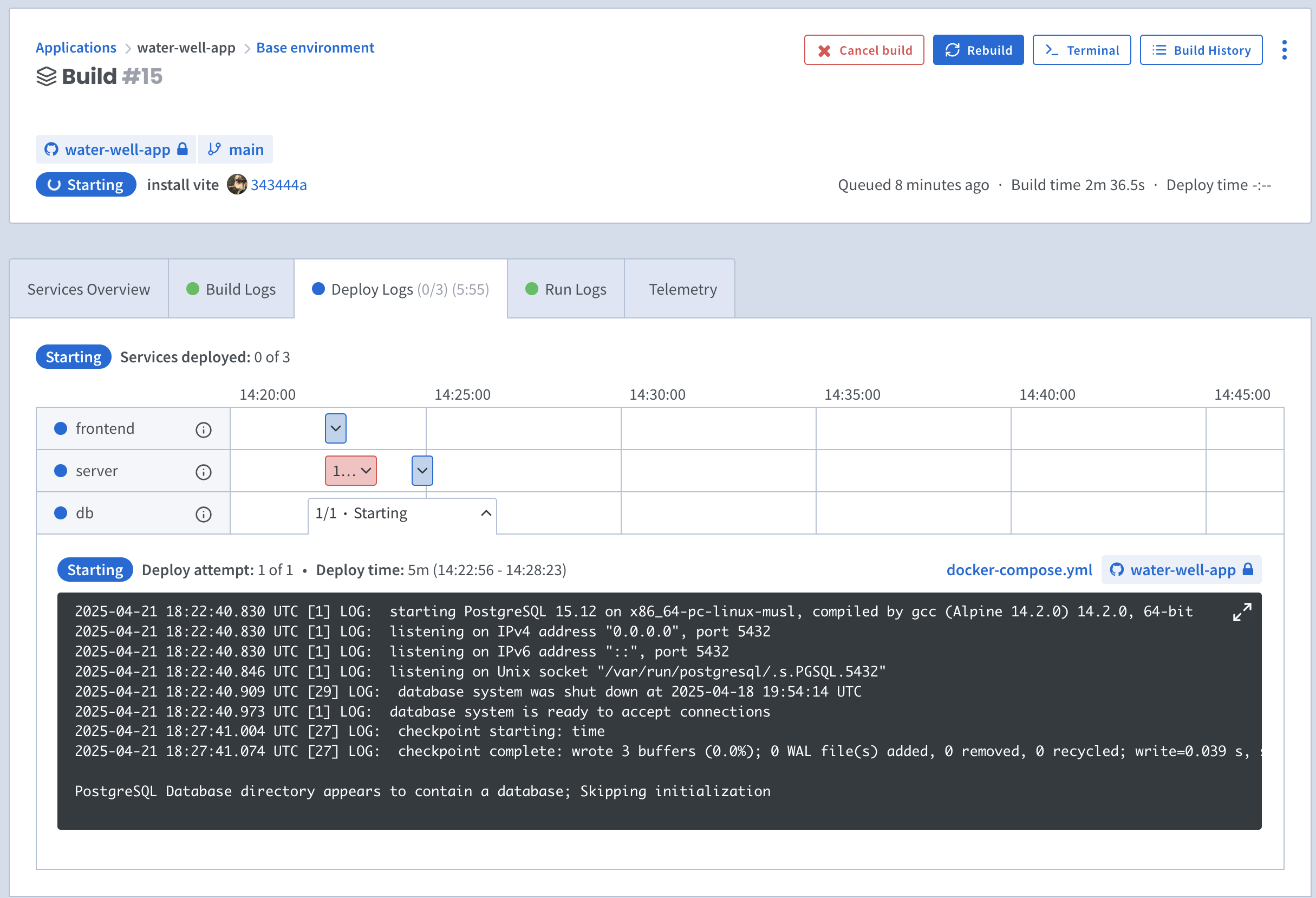 From here, your app will build. You can check out the Build, Run, and Deploy logs to see if you need to adjust anything config-wise. To make changes, go back to your vibe coding IDE and either manually edit the code, or ask the LLM to solve for the issues the logs are showing. As soon as you (or the agent) commit that, the Shipyard environment will rebuild to reflect those code changes.